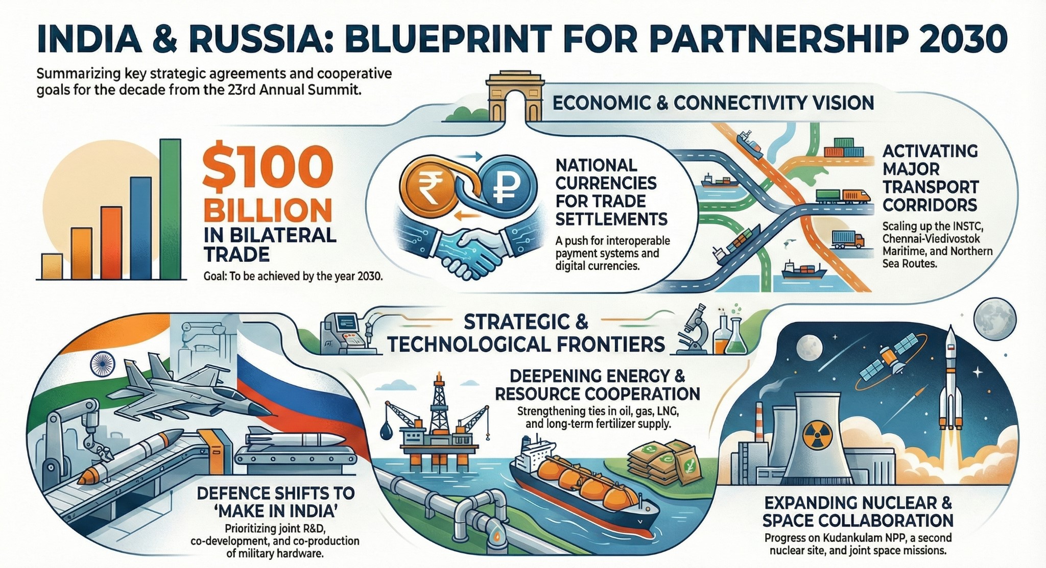 The 23rd India–Russia Annual Summit reinforced the depth and resilience of the bilateral partnership. With the adoption of Programme 2030 and new agreements across defence, energy, nuclear, connectivity, and skilled mobility, the summit sets a long-term trajectory for strategic cooperation. Both nations continue to align on key global issues, reaffirming the partnership’s relevance in an evolving geopolitical landscape.