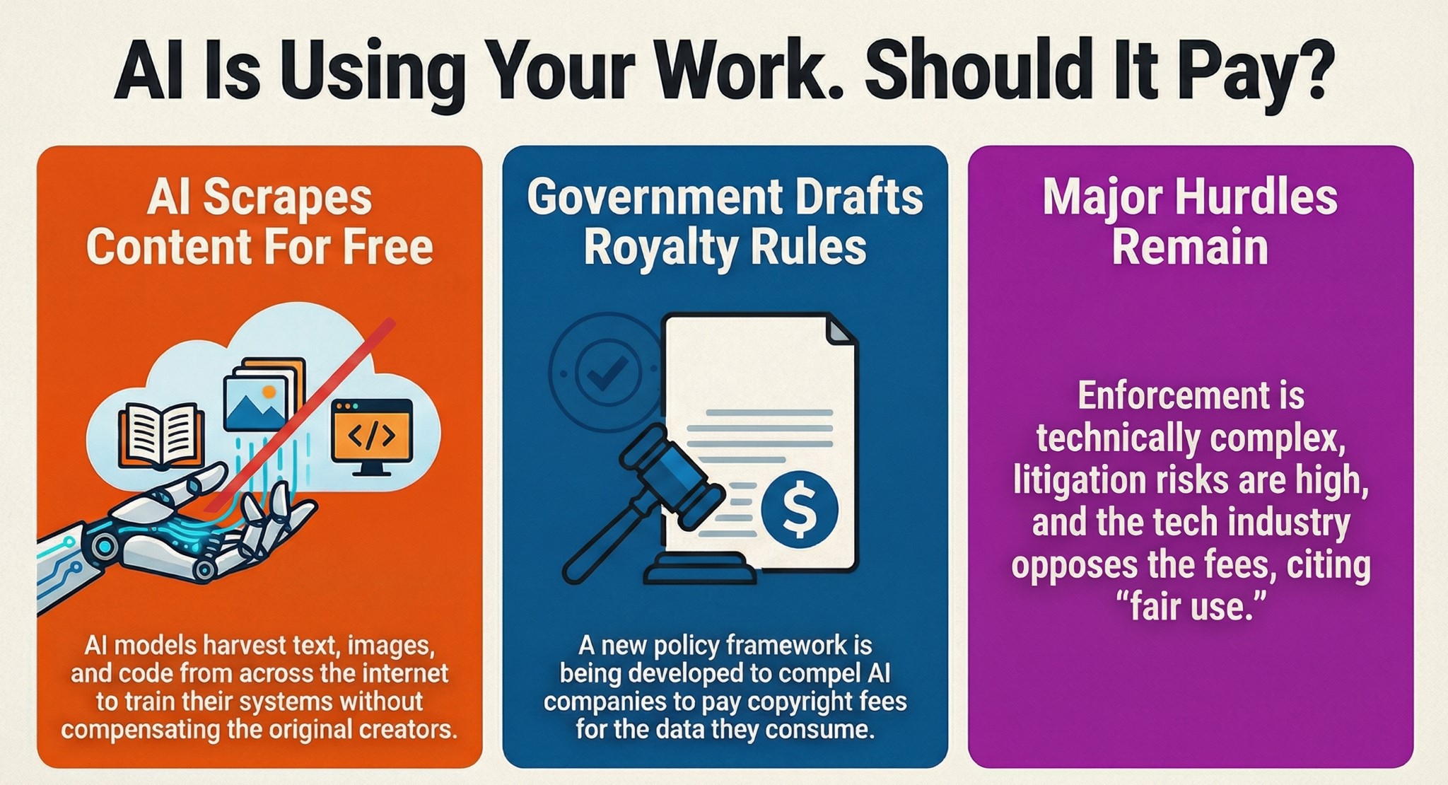 As Generative AI models continue to expand, a significant debate has emerged regarding intellectual property. The core conflict lies between AI developers who use vast amounts of online data to train their models and content creators who receive no compensation for the use of their work.