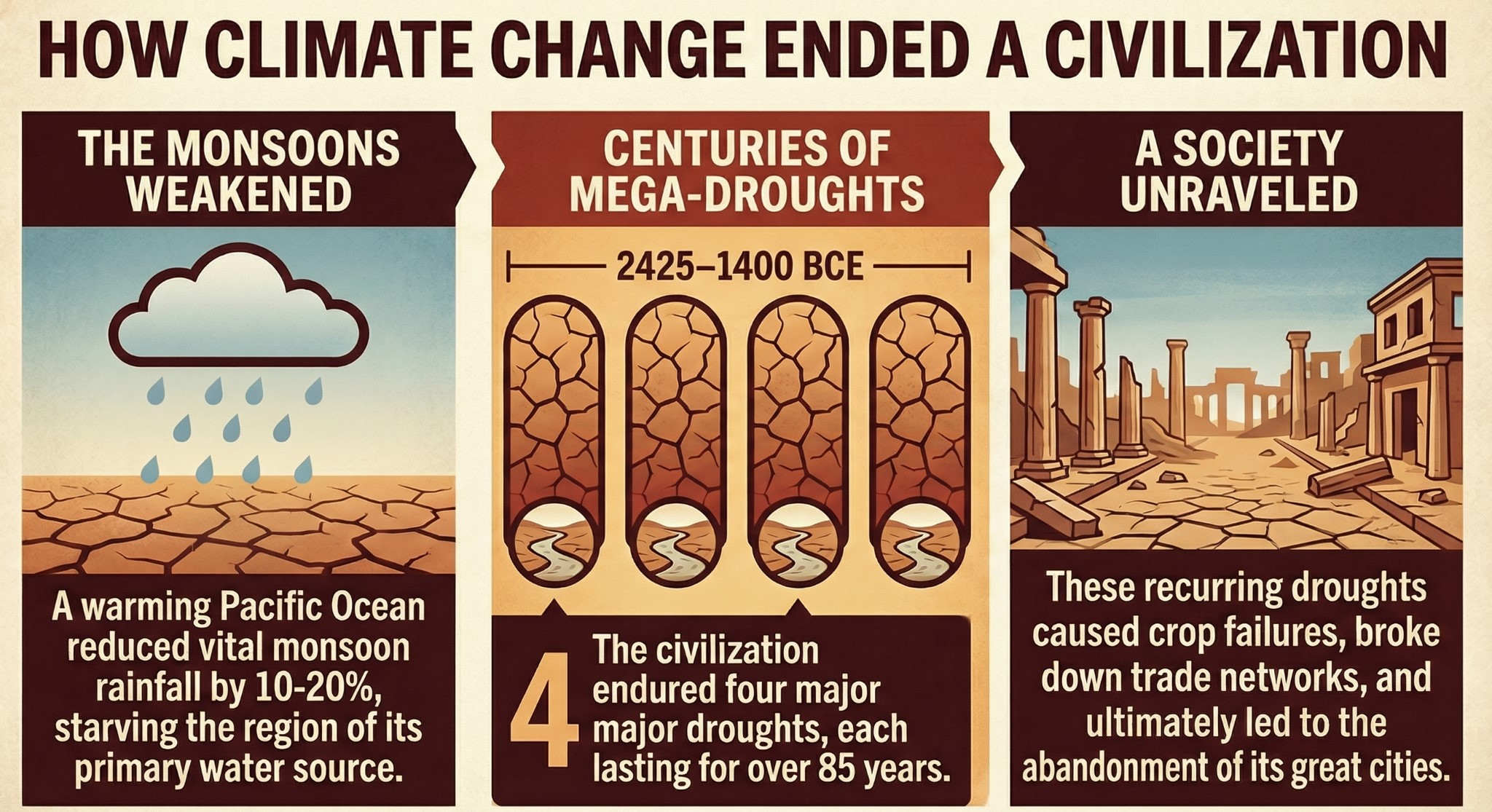 - These droughts did not occur once but in cycles, creating centuries of hydrological instability, which progressively weakened agriculture, trade, and urban functioning.