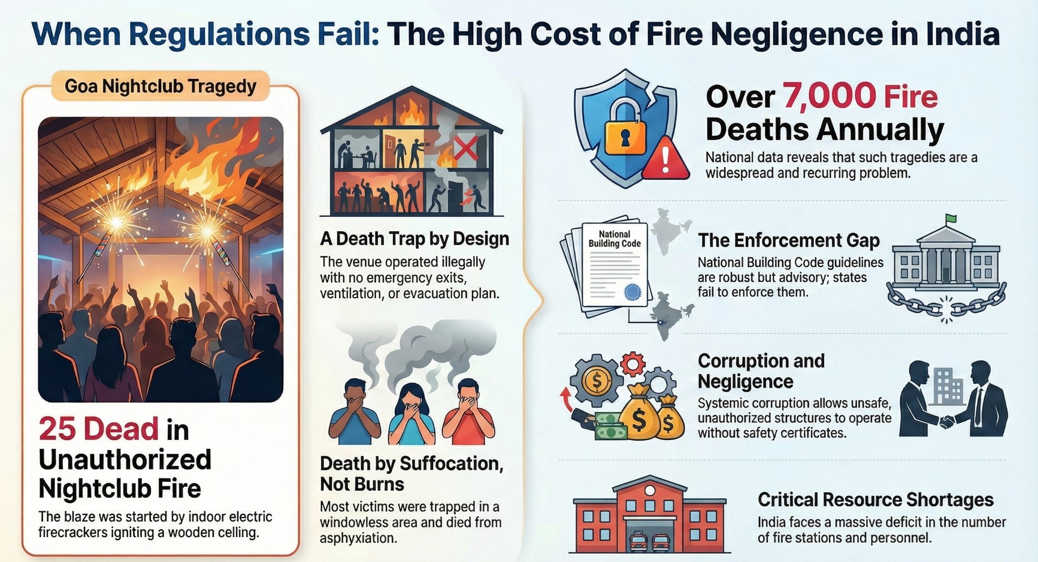 The Goa tragedy serves as a grim reminder that safety cannot be a byproduct of compliance; it must be a prerequisite for operation. To prevent such "man-made disasters," India needs a paradigm shift from reactive firefighting to proactive fire prevention, anchored in strict enforcement and civic responsibility.