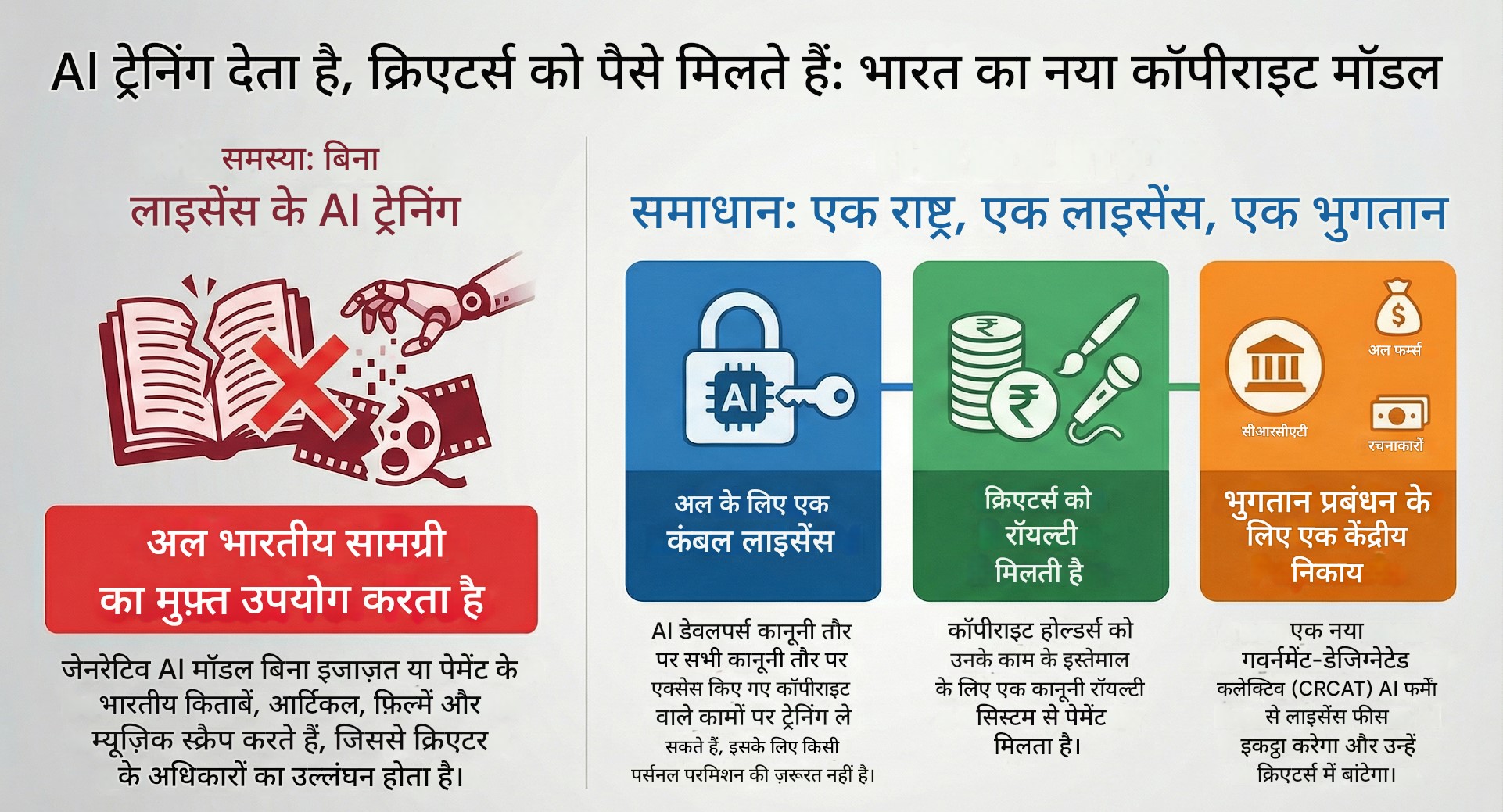 सरकार ने जनरेटिव एआई और कॉपीराइट पर कार्यपत्र जारी किया है - एक राष्ट्र, एक लाइसेंस, एक भुगतान, जिसमें कॉपीराइट वाली रचनाओं पर एआई प्रशिक्षण को विनियमित करने के लिए भारत का पहला संरचित मॉडल प्रस्तावित किया गया है। इसका उद्देश्य रचनाकारों के अधिकारों और एआई नवाचार के बीच संतुलन स्थापित करना है, जो भारतीय सामग्री पर अनधिकृत प्रशिक्षण को लेकर एएनआई बनाम ओपनएआई (दिल्ली उच्च न्यायालय, 2024-25) जैसे बढ़ते विवादों के मद्देनजर है।
