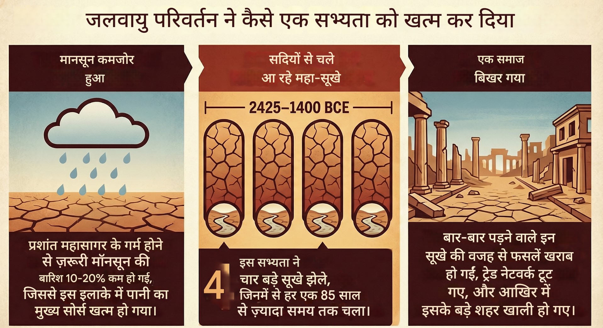 - ये सूखे एक बार नहीं बल्कि चक्रों में आए, जिससेसदियों की जलवैज्ञानिक अस्थिरताजिसके कारण कृषि, व्यापार और शहरी कामकाज धीरे-धीरे कमजोर होते चले गए।
