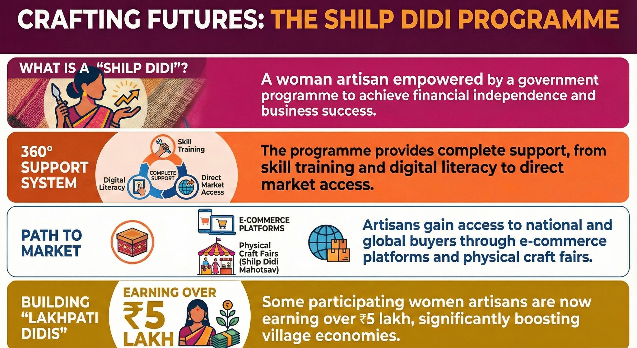 The Union Textiles Secretary announced that the Shilp Didi Programme has significantly boosted women artisans’ income, with some earning over ₹5 lakh. The initiative is part of the government's focus on empowering women artisans, strengthening village economies, and promoting the 'Lakhpati Didi' vision.